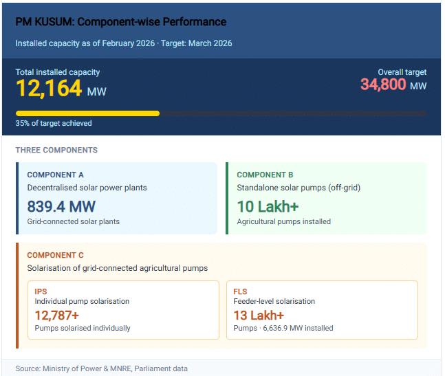 3. With the focus on promoting solarisation in the agricultural sector, It aimed to add Solar capacity of 34,800 MW by March 2026. As of February 2026, a total of 12,164 MW capacity has been installed under the scheme. It consisted of three components: